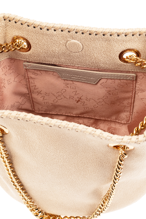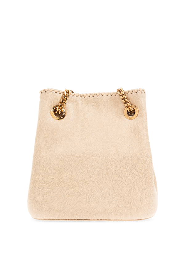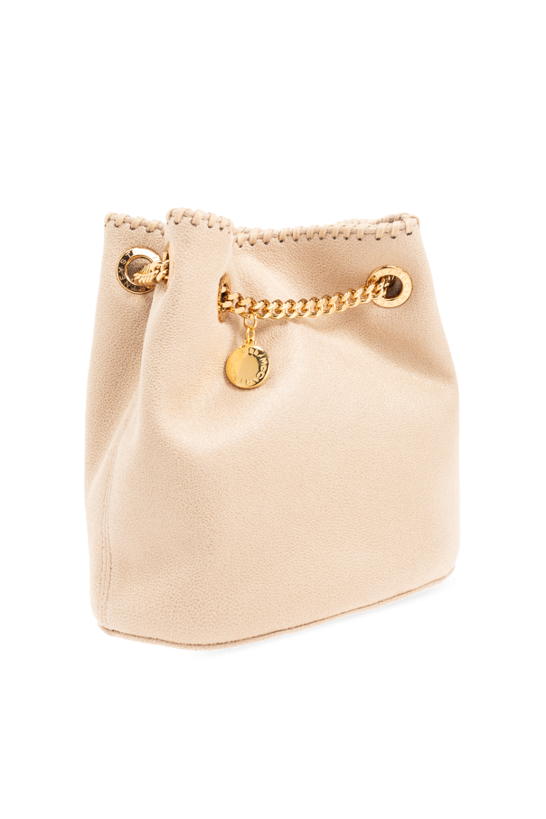 Beige ‘Falabella’ bucket shoulder bag from Stella McCartney. Made of partially recycled vegan leather with a slight sheen and suede trim, this design secures with a magnetic fastener and features a chain shoulder strap accentuated with a logo-engraved round charm, gold-tone metal hardware and one internal compartment with a card slot.