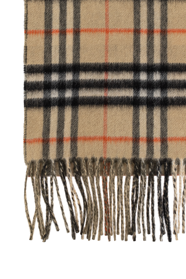 Introducing the exquisite Cashmere Scarf with Check Pattern by the illustrious Burberry. This luxurious accessory epitomizes timeless elegance, crafted from the finest cashmere. Its classic check pattern, featuring a harmonious blend of beige, black, white, and red lines, exudes sophistication and style. The scarf is adorned with delicate fringes at each end, enhancing its elegant finish. Its sumptuous texture and superior quality are evident in every fold, making it not only a visual delight but also a tactile pleasure. Whether draped gracefully around the shoulders or wrapped snugly for warmth, this scarf is a versatile addition to any wardrobe. Why Choose This Product? Crafted from 100% premium cashmere for ultimate softness and warmth. Classic check pattern synonymous with Burberry\'s signature style. Elegant fringed ends for a refined touch. Versatile styling options for both formal and casual ensembles.