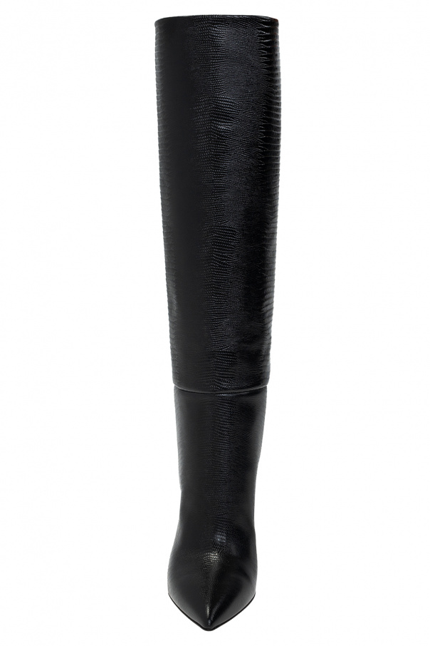 Black 'Stiletto' knee-high boots from Paris Texas. Crafted from leather with a lizard skin effect, this pair boasts a pointed toe silhouette and a beige leather sole.