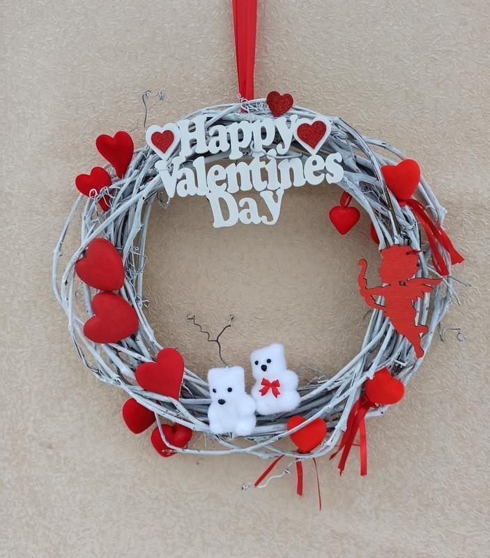 Декор до дня святого Валентина, вінок на двері білий з червоними серцями, ведмедиками та купідоном.