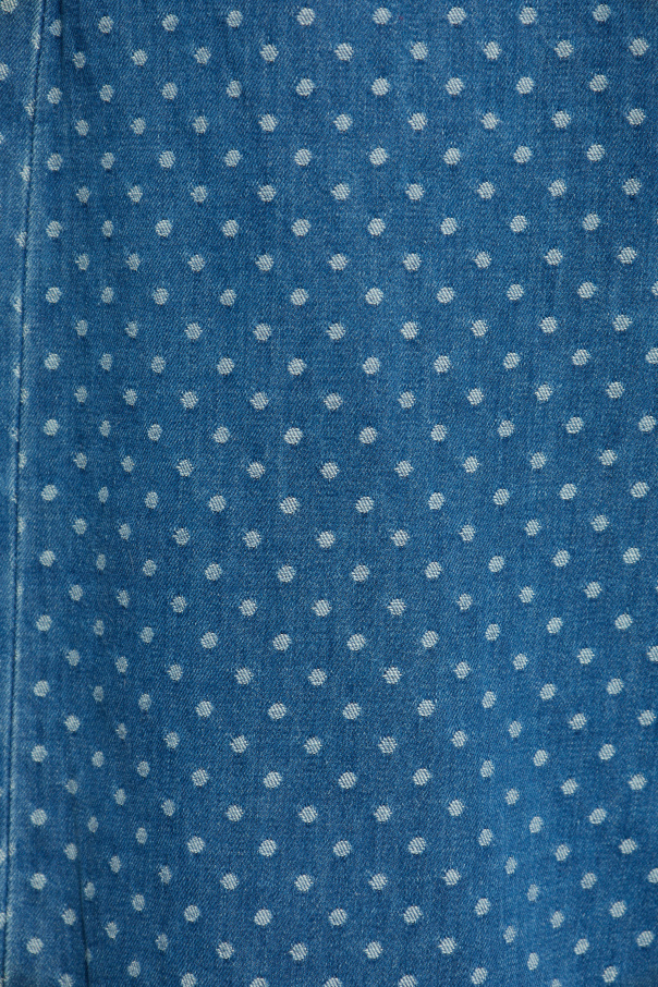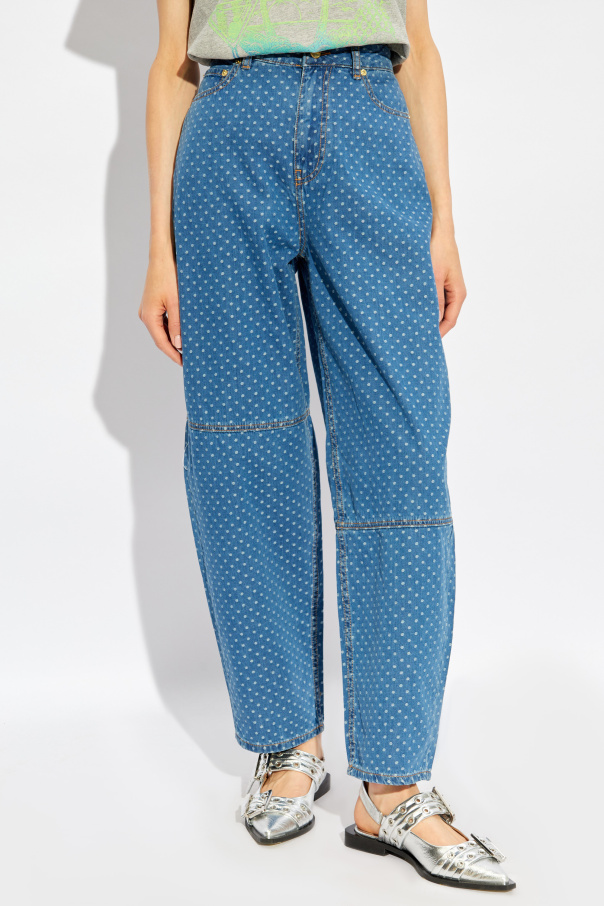 Introducing the Ganni Polka Dot Flared Jeans, a breathtaking fusion of whimsy and sophistication. Crafted from 100% Organic Cotton, these jeans offer both unparalleled comfort and a commitment to sustainability. The playful polka dot pattern set against a rich blue canvas evokes a sense of whimsical elegance, making these jeans a standout piece in any wardrobe. The flared silhouette, iconic of the bell-bottom style, is accentuated by contrasting stitches in a lighter shade, beautifully outlining the shape of the legs and dividing the jeans into sections for a truly unique appearance. Classic features such as button closure, belt loops, and five pockets blend seamlessly with modern design elements, creating a pair of jeans that is both timeless and contemporary. With their subtle branding, the Ganni Polka Dot Flared Jeans speak to the brand\'s minimalist aesthetic, focusing on the quality and design of the product rather than overt logos. This approach underscores the exclusivity and refined taste that Ganni is renowned for. Why Purchase These Jeans? Made from 100% Organic Cotton for ultimate comfort and durability. Unique polka dot design and flared silhouette for a standout, fashionable look. Contrasting stitching detail that highlights the jeans\' unique sections and shape. Subtle branding for an elegant, minimalist aesthetic. Versatile enough to be dressed up or down for various occasions.