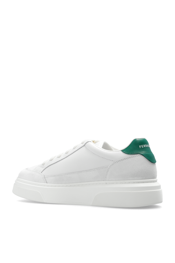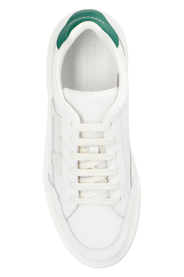 White and green ‘Cassina’ sneakers from FERRAGAMO. Made of smooth calf leather and suede, this lace-up model sits on a white rubber sole and showcases the brand\'s logo and swappable lases. Medium insole.