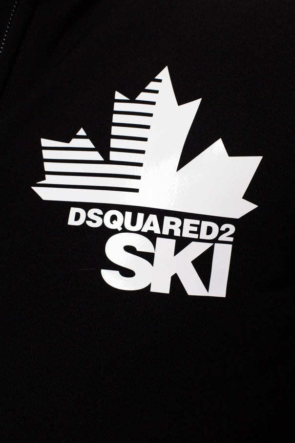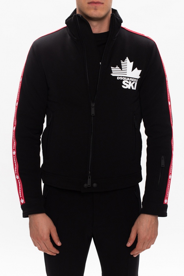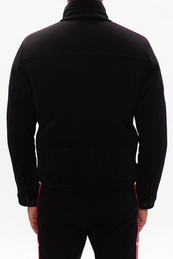 Black jacket from Dsquared2. Crafted from cotton, this garment features a zip and snap fastening, a white logo print, two zip pockets and two red grosgrain straps on the sides printed with a white logo.