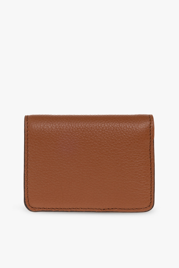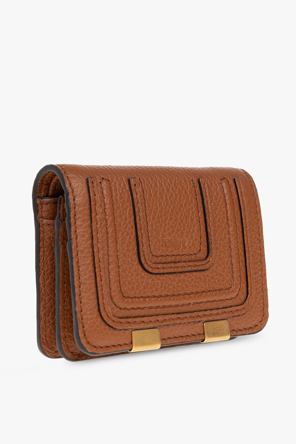 Brown ‘Marcie Small’ wallet from Chloé. Made of calf leather, this item features a snap closure, embossed logo and gold-tone metal appliqués. It has a bill compartment, zipped coin pocket and six card slots inside.