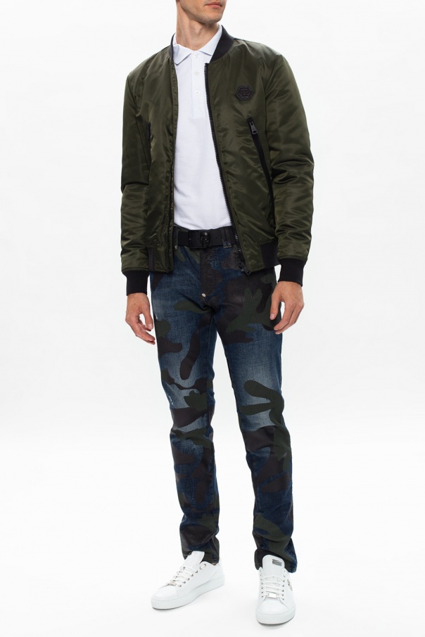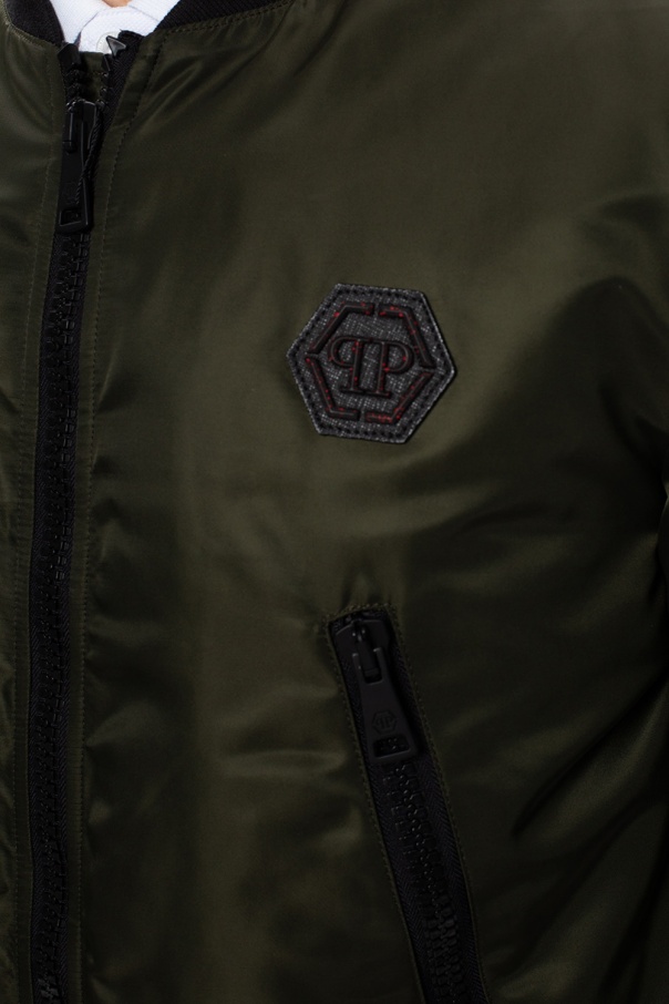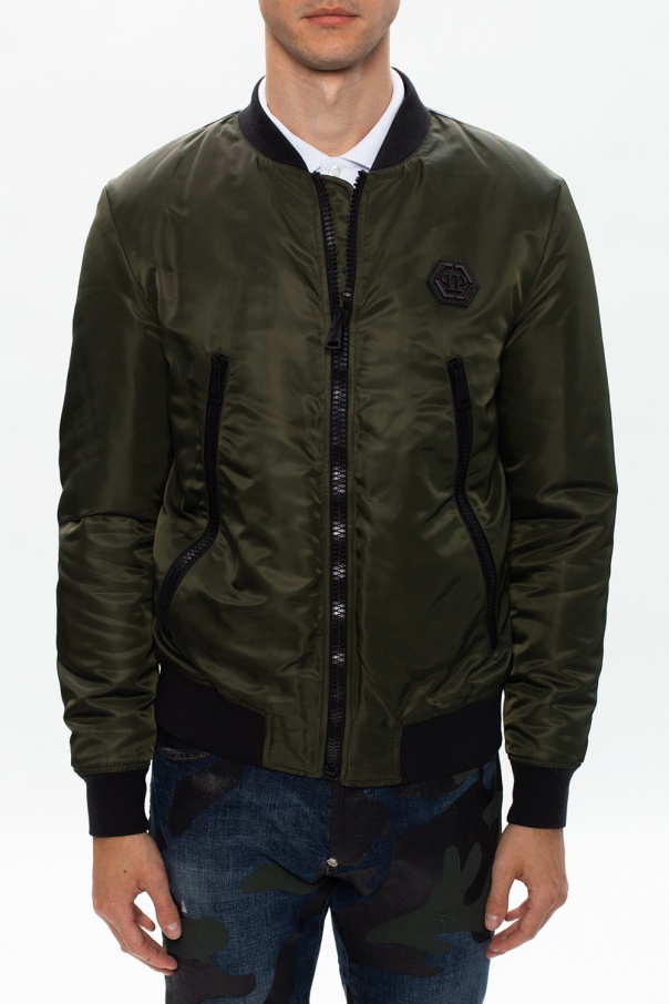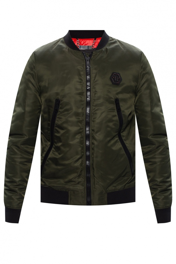 Green, black and red bomber jacket from Philipp Plein. Fastened with a zip, this garment features a logo patch, two front zip pockets and ribbed trims at the hem and cuffs.