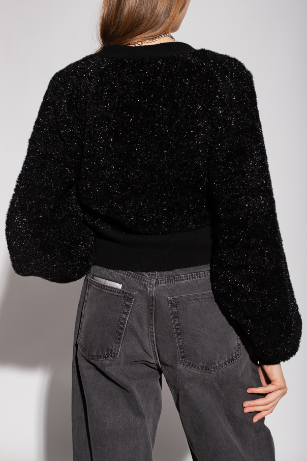 Black cardigan from Ganni. Crafted with a touch of glistening metallic yarn, this style features distinctive buttons with white and silver-tone gemstones, a V-shaped neckline, puff sleeves and elastic edges.