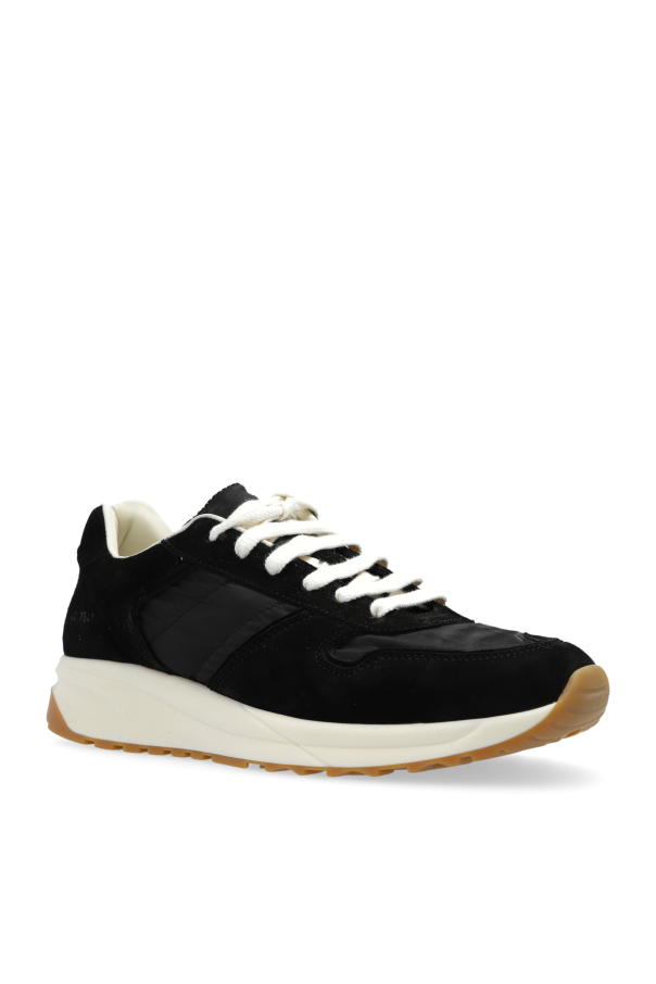 Introducing the Track sneakers from Common Projects, an epitome of elegance and sporty sophistication in the exclusive WOMEN, SHOES, SNEAKERS, LOW TOPS category. Designed by the illustrious duo Flavio Girolami and Prathan Poopat, these sneakers showcase the pinnacle of Italian craftsmanship and minimalist design. Crafted in a dominant black hue, the Track sneakers are an exquisite blend of textile and suede materials. The classic low-top silhouette is complemented by a white sole with a contrasting light brown bottom, exuding an air of elegance and style. The white laces not only enhance the sporty aesthetic but also provide a striking contrast to the black upper. Delicate stitching along the sides adds structure and a touch of intricate design, while a small, gold inscription on the outer heel subtly highlights the brand\'s distinctive mark. Inside, the sneakers are lined with a light material, ensuring unparalleled comfort. The insole bears the inscription \"WOMAN by COMMON PROJECTS\" along with a serial number, a hallmark of the brand\'s authenticity. The thick rubber sole offers excellent cushioning and comfort, making these sneakers a perfect fusion of style and functionality. Why Choose This Product? Exquisite Craftsmanship - Impeccable Italian design and construction. Premium Materials - High-quality textile, suede, and rubber components. Elegant Design - Classic low-top silhouette with sophisticated details. Comfort - Light inner lining and cushioned rubber sole for supreme comfort. Exclusive Branding - Unique gold inscription and brand markings.