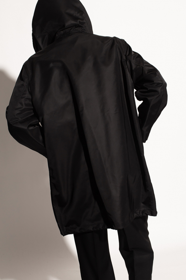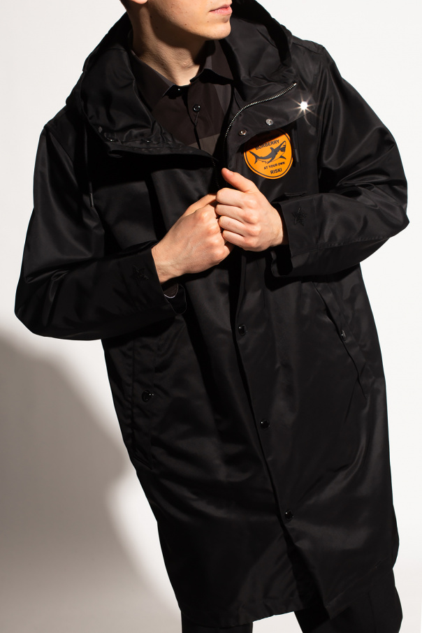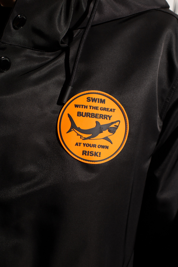 Black hooded jacket from Burberry. Fastened with a two-way zip and snaps, this design features a drawstring hood, sewn-on logo appliqué in orange and black, two front pockets with snap closure and a drawstring hem.