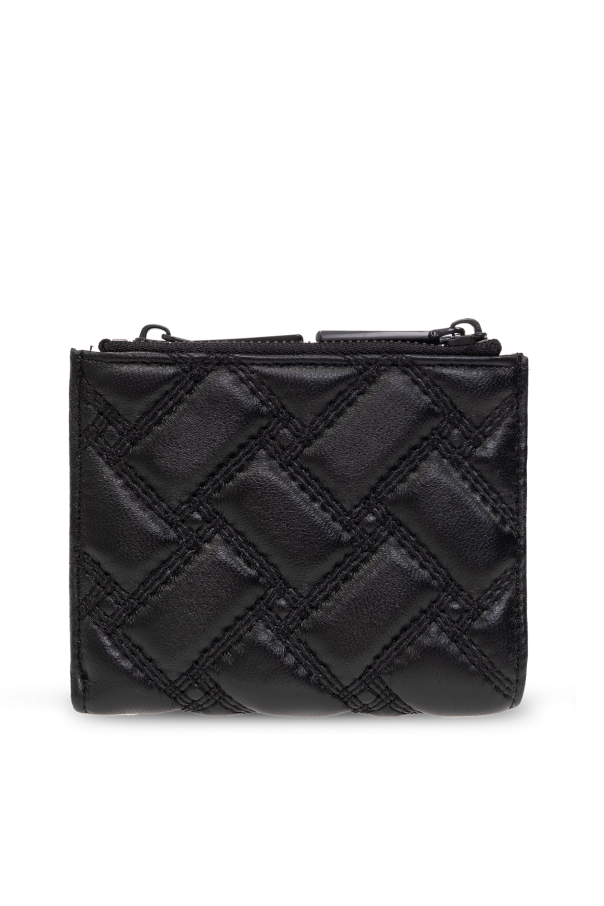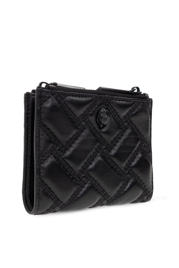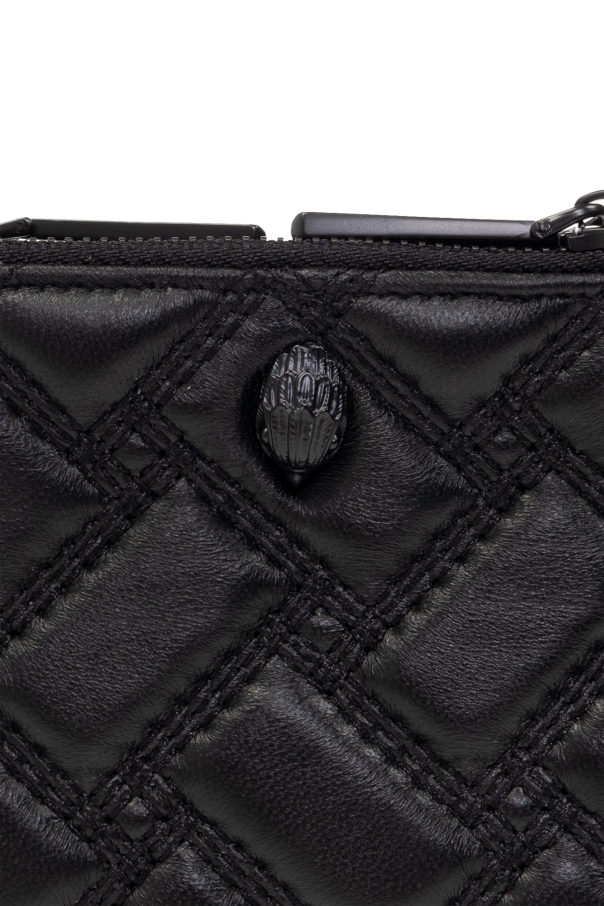 Black ‘Kensington Mini Purse’ quilted wallet from Kurt Geiger. Made from leather, this design fastens with a snap and showcases a crystal-encrusted metal Eagle head plaque, two external zip pockets, black metal hardware and one internal compartment with five slip pockets.