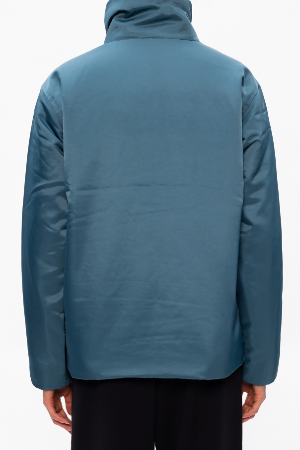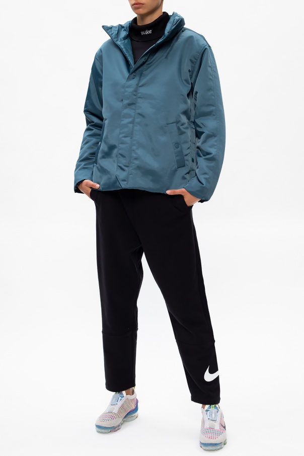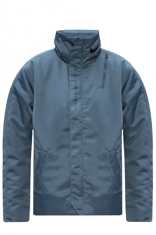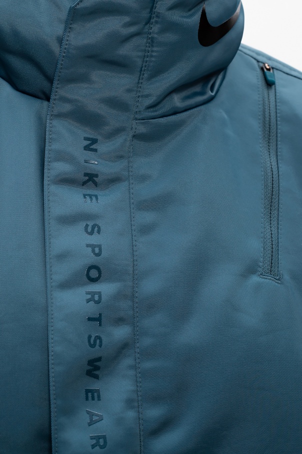 Blue hooded jacket from Nike. Equipped with eco insulation, this unique piece of outerwear fastens via zipper and snap-buttons and employs snap adjusters on the sides, black logo print at high collar and two snap-fastened pockets and one zip pocket on the front. The Thermore™ EcoDown insulation was made from recycled PET bottles.