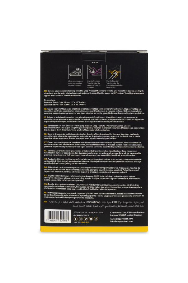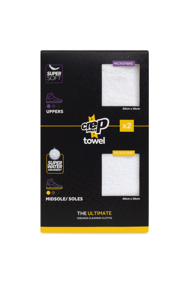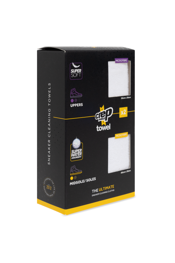 Introducing the Crep Protect Shoe Cleaning Towel Duo, an exquisite addition to any sneaker enthusiast\'s collection. Crafted with precision, these towels are composed of premium microfiber, ensuring unparalleled softness and efficacy in cleaning. The pristine white hue is elegantly contrasted with violet and yellow stitching, while each towel is adorned with the iconic \"cure\" logo and a distinctive yellow flag emblem. Encased in a sleek black package that reveals the towels\' plush texture, this set highlights their super absorbent and gentle qualities. The set comprises two sizes: a 30x30 cm towel for the upper parts of sneakers and a 40x40 cm towel for midsoles and outsoles, making them indispensable for lifestyle maintenance. Why Choose This Product? Expertly designed by the renowned Crep Protect, leaders in shoe care since 2012. High-quality microfiber construction for superior cleaning performance. Elegant design with contrast stitching and iconic branding. Perfectly sized for comprehensive sneaker care. Exclusive packaging, ideal for gifting or personal use.