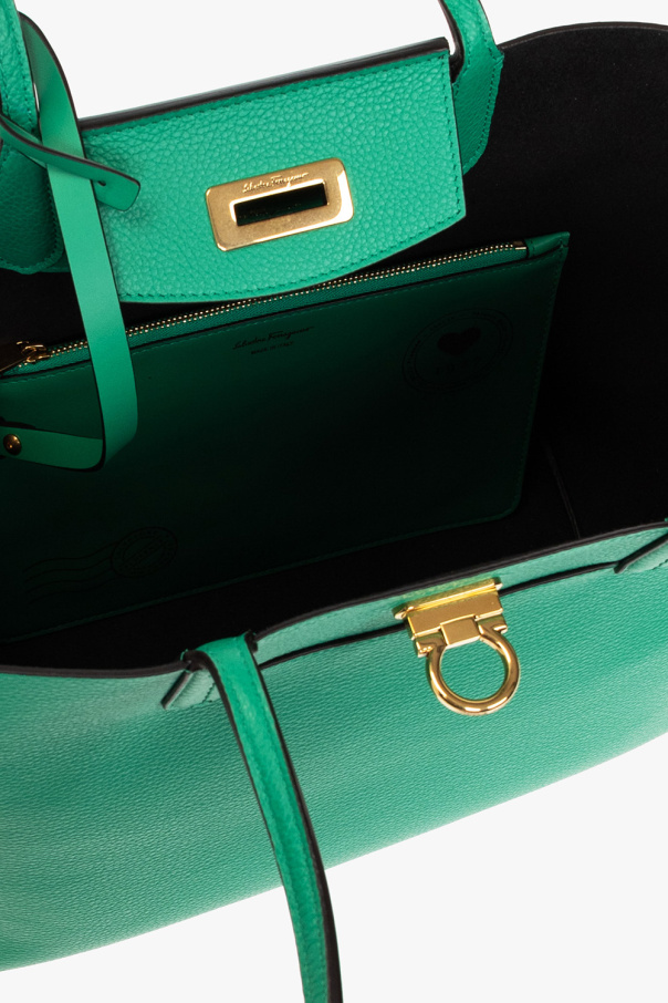 Green shopper bag from FERRAGAMO. Crafted from grained calf leather, this design features a distinctive Gancini fastener, two half-round handles, and one internal compartment with a removable zip pouch printed with gold-tone logos.