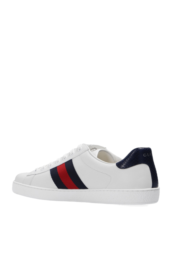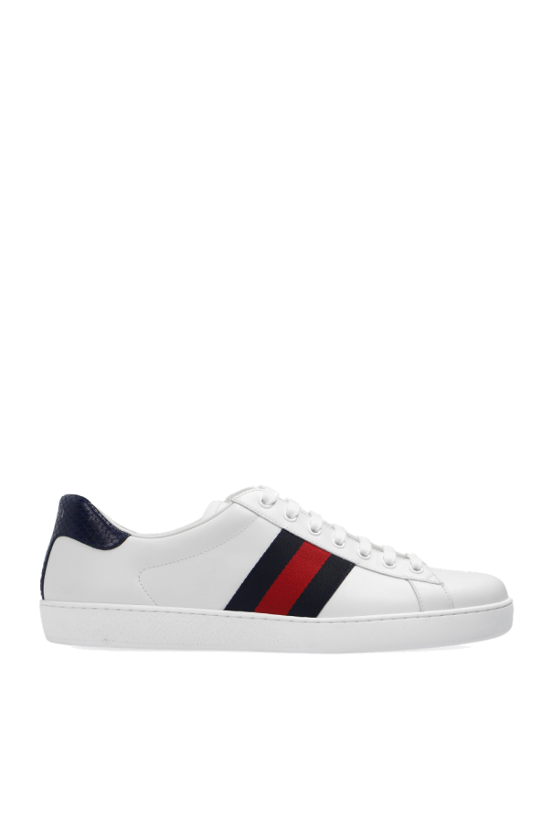 White ‘Ace’ sneakers from Gucci. Crafted from leather, this lace-up design set on a white rubber sole features a white and navy Web motif and a silver-tone logo print.