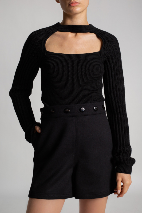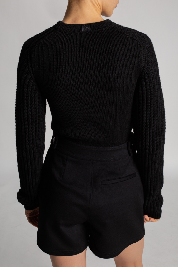 Black crewneck sweater from Loewe. Crafted from wool with a cropped silhouette, this style features a cut-out on the front, a logo patch on the back and ribbed edges.