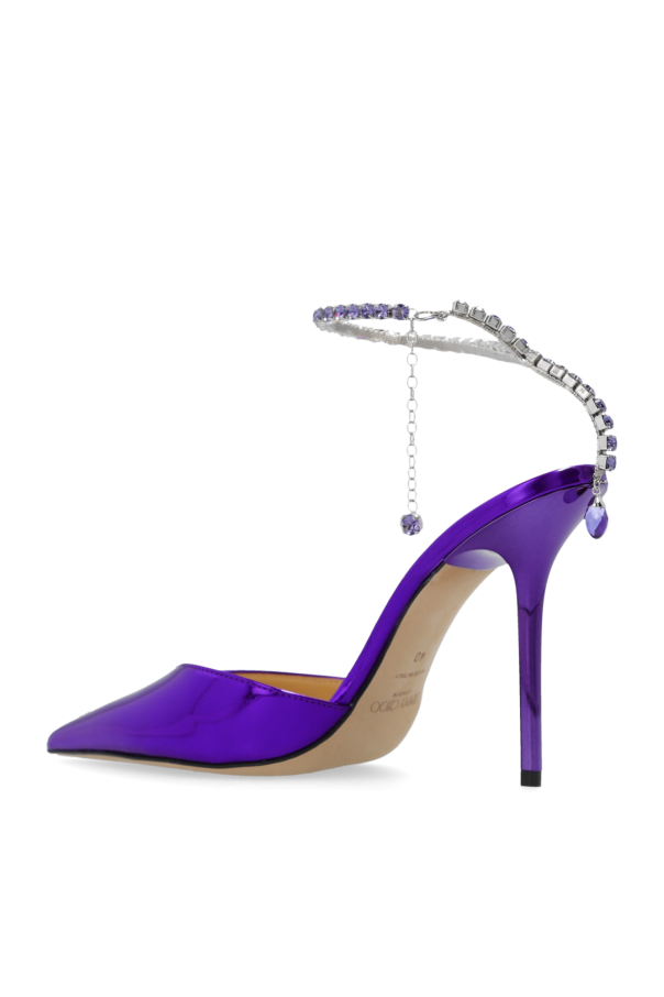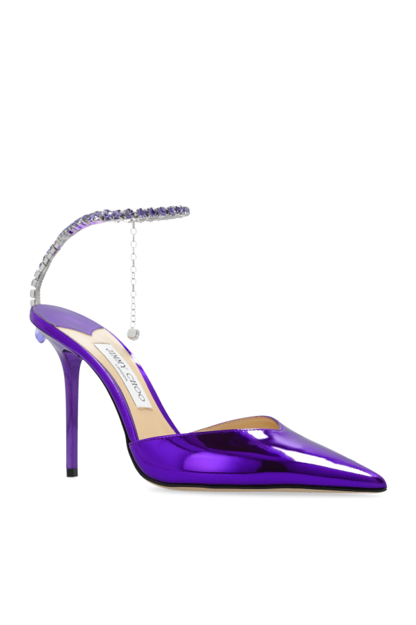 Purple ‘Saeda’ pumps from Jimmy Choo. Made of patent leather with a pointed toe silhouette, this model sits on a cream leather sole and features an crystal-bejewelled ankle chain strap.
