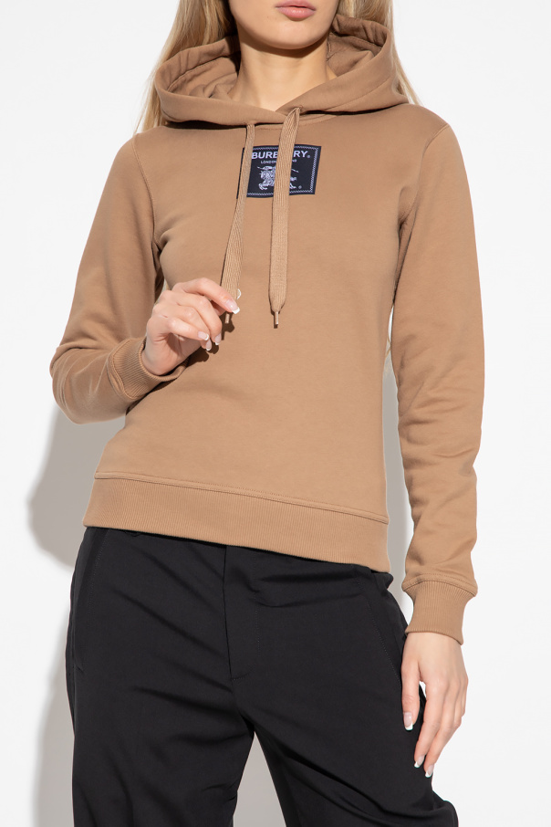 Light brown ‘Vivienne’ hoodie from Burberry. Made of organic cotton, this design features a drawstring hood, black and silver-tone logo patch and ribbed trims at the hem and cuffs.