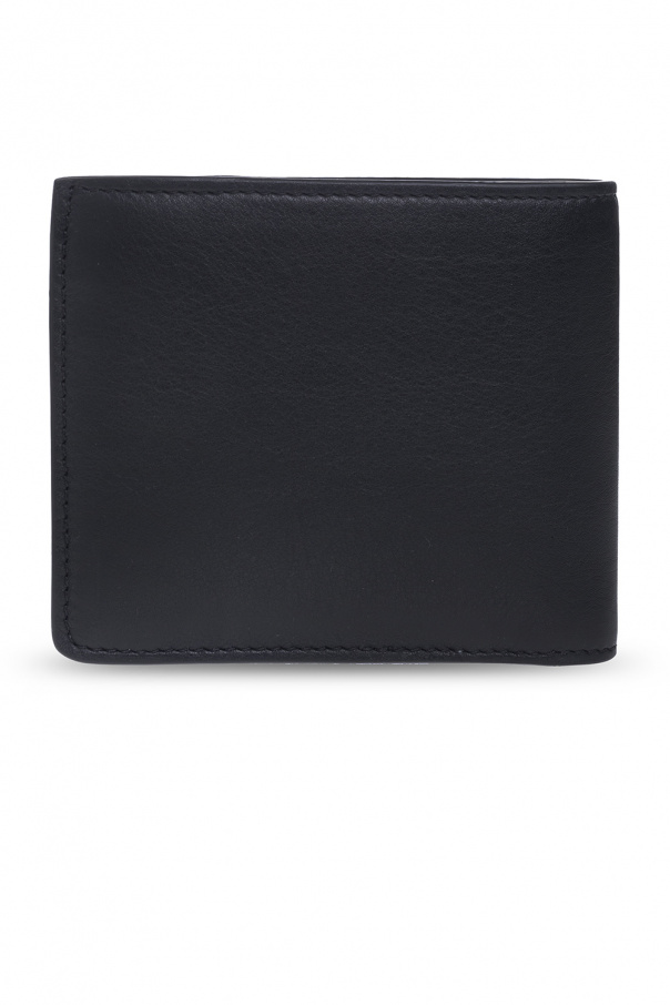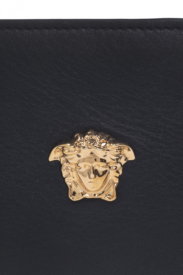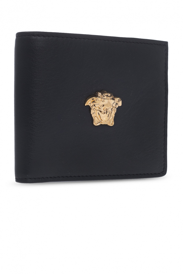 Black folding wallet from Versace. Made of leather, this item is decorated with a metal appliqué with the Medusa head in gold-tone. It has two bill compartments, two slip pockets, three card slots and zipped coin pocket.