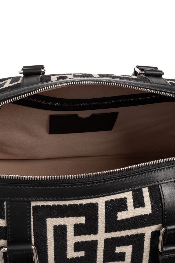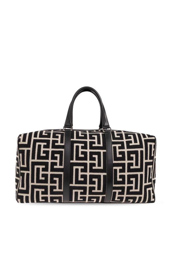 Black and cream travel bag from Balmain. Made of fabric with a jacquard monogram and leather trims, this design features a two-way zip, two half-round handles, detachable and adjustable shoulder straps, silver-tone metal hardware and one internal compartment with one zip pocket and one card slot.