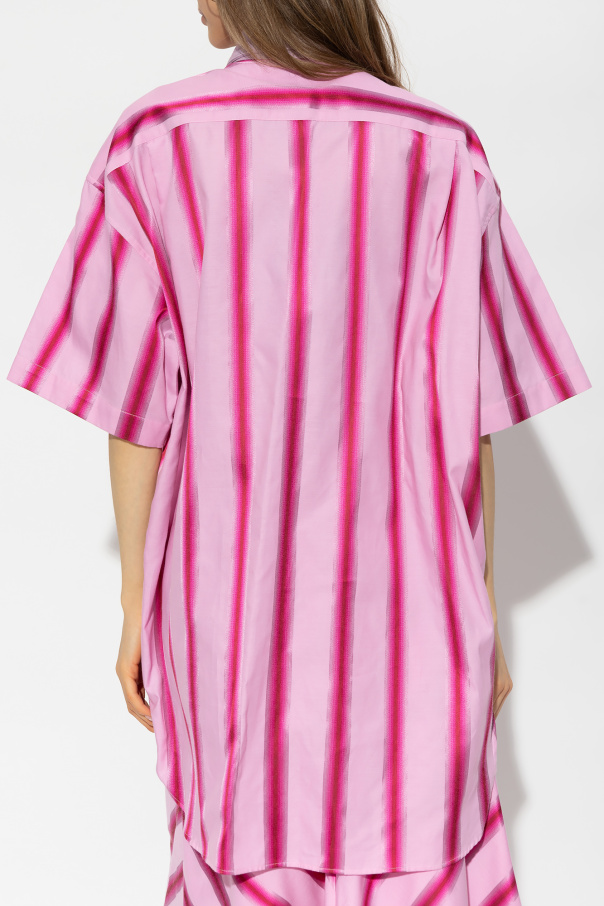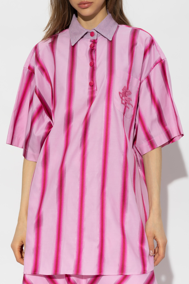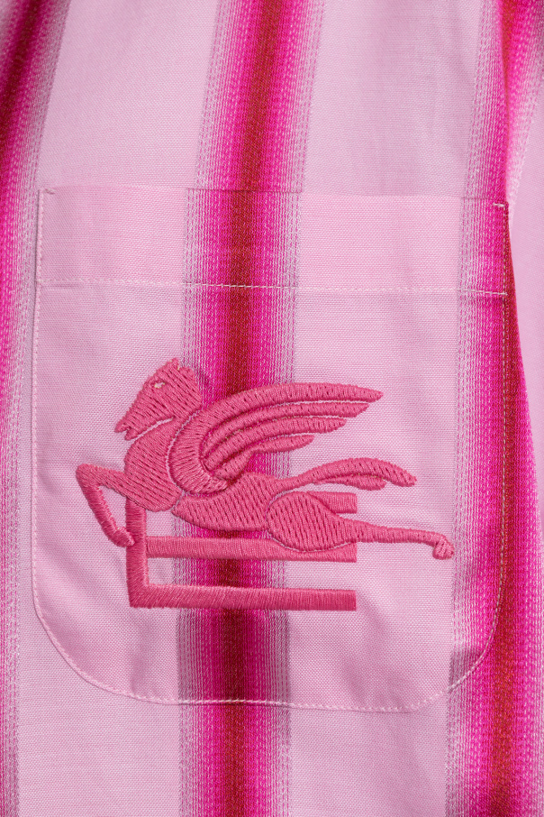 Pink shirt from Etro. Crafted from a cotton and silk blend with an oversize fit, this style showcases vertical stripes. It is complete with a denim collar with snaps, one slip chest pocket with an embroidered logo and short sleeves.