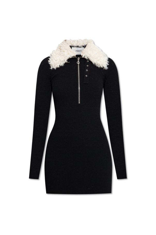 Black dress from Coperni. Crafted from ribbed material with a form-fitting silhouette, this style features an adjustable strap and detachable detail in cream faux-fur on the collar, long sleeves and a zip fastening with a logo pendant.