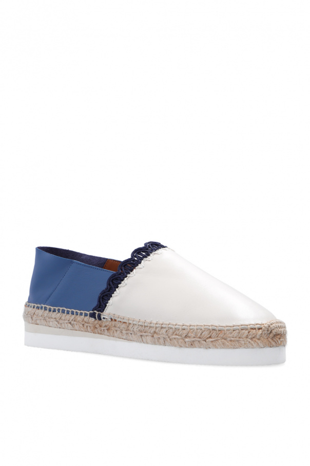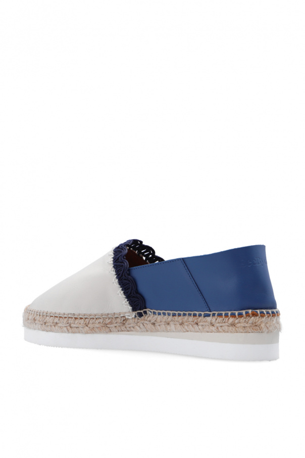 Blue and cream ‘Glyn’ platform espadrilles from See By Chloé. Crafted from calf leather, this model features an embossed logo, decorative topstitched details, a fold-down heel and a white and beige rubber sole with a jute overlay.