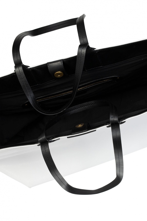 White shopper bag from Isabel Marant. Crafted from leather, this design fastens with a magnetic snap and is decorated with an embossed logo pattern in gold-tone. It is complete with four half-round handles, decorative stripes on the sides, black leather trims and one internal compartment with one zip pocket.