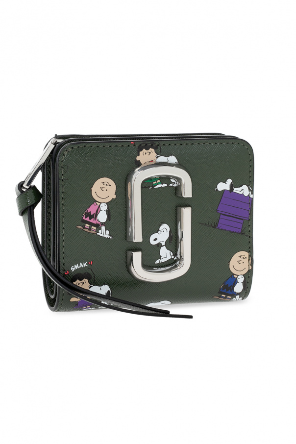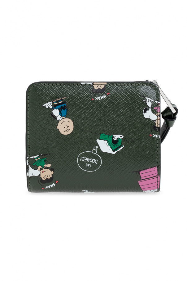 Dark green wallet from Marc Jacobs (The) x Peanuts. Emblazoned with a metal logo plaque and a colourful graphic motif, this item features a snap fastening, a zipped coin pocket, silver-tone metal hardware and an interior with a bill compartment, five card slots and three slip pockets.