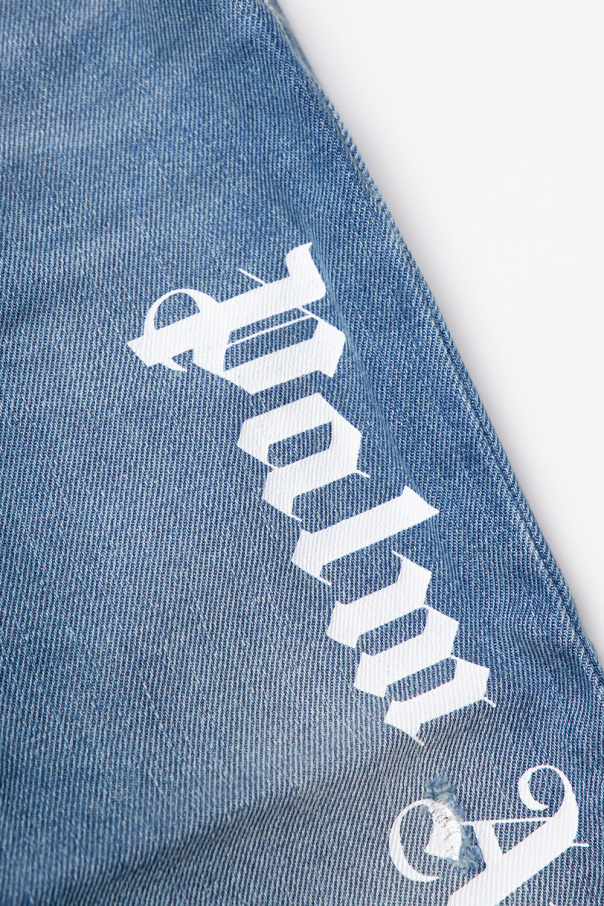 Blue distressed jeans from Palm Angels Kids. Decorated with a white logo print, this pair falls down with straight legs and is complete with an elastic waistband, three front pockets and two back pockets.
