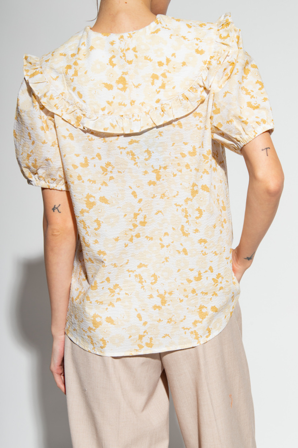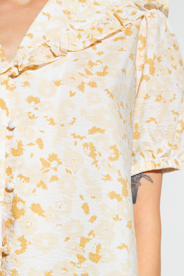 White, cream and beige ‘Jytta’ shirt from Samsoe Samsoe. Crafted from textured organic cotton, this loose-fitting garment features button fastenings, floral pattern, decorative collar with a ruffle and short sleeves with elasticated cuffs.