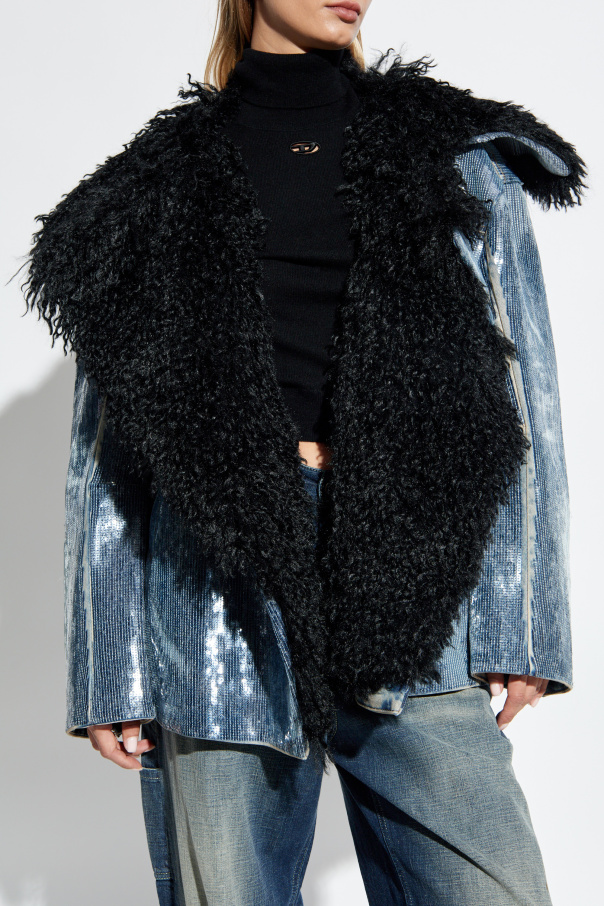 Indulge in the epitome of sartorial elegance with the DE-BIKA-S jacket from Diesel\'s exclusive women\'s collection. This masterpiece combines modern design with luxurious details, making it an essential addition to any discerning wardrobe. Crafted from a sumptuous blue fabric, this jacket features prominent vertical stripes and a lustrous finish, exuding a sophisticated charm. The oversized silhouette and long sleeves, accentuated with zippers on the cuffs, offer a contemporary twist, ensuring both comfort and style. The pièce de résistance is undoubtedly the large, plush black fur collar, which introduces a touch of opulence to the ensemble. Complemented by bold stitching and sleek zippers, the DE-BIKA-S jacket is a testament to Diesel\'s commitment to unparalleled quality and avant-garde fashion. Why Choose This Product? Elegant and modern oversized design Luxurious fur collar for a touch of sophistication High-quality fabric with a striking blue hue and glossy finish Functional design with two slip pockets Distinctive zippers on cuffed sleeves