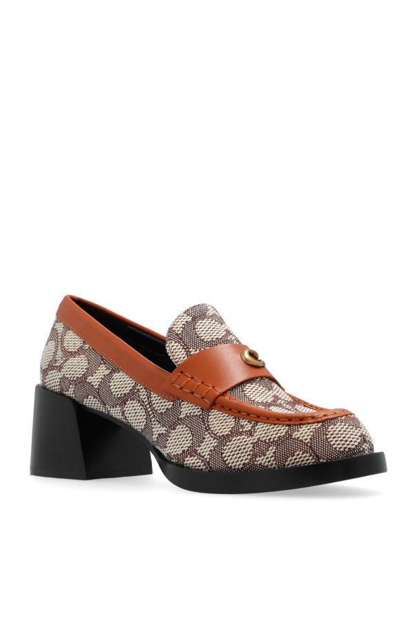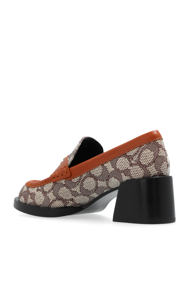 Introducing the \"Natalie\" heels by Coach, an embodiment of timeless elegance and modern sophistication. These mid-heel shoes capture the essence of feminine grace, making them a quintessential addition to any discerning woman\'s wardrobe. The Natalie heels showcase a beige color palette accented with darker tones, creating a distinctive pattern reminiscent of the brand\'s iconic logo or monogram. Contrasting inserts in shades of brown or orange add a touch of vibrancy, making these shoes a statement of both style and subtlety. Crafted from a luxurious combination of natural leather and high-quality fabric, these heels promise both durability and comfort. Their design features a classic, rounded toe front adorned with a strap and an ornamental buckle or button, lending a nod to the traditional men\'s shoe silhouette, reimagined with a feminine twist through the addition of a sturdy, black mid-height heel. The meticulous construction is evident in the precise stitching and edging, highlighting the high production standards. The interior boasts a black, high-quality leather lining, complete with the designer\'s logo on the insole, ensuring both comfort and a touch of exclusivity. Why Purchase the \"Natalie\" Heels? Elegant design that combines classic and modern elements Constructed from premium leather and fabric for durability and comfort Stable, mid-height black heel suitable for various occasions Exquisite detailing, including a brand-reminiscent pattern and ornamental buckle High-quality, black leather interior with designer logo, signifying luxury