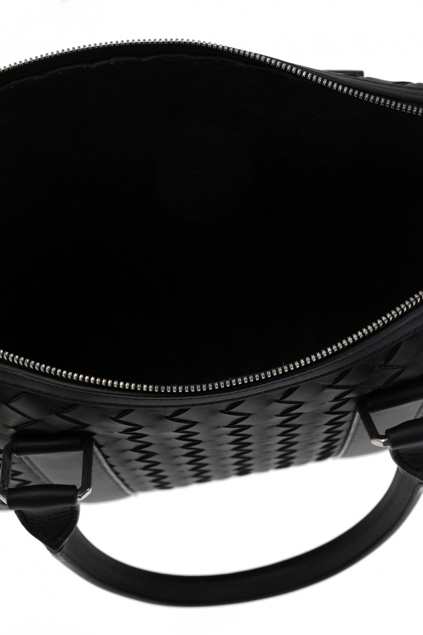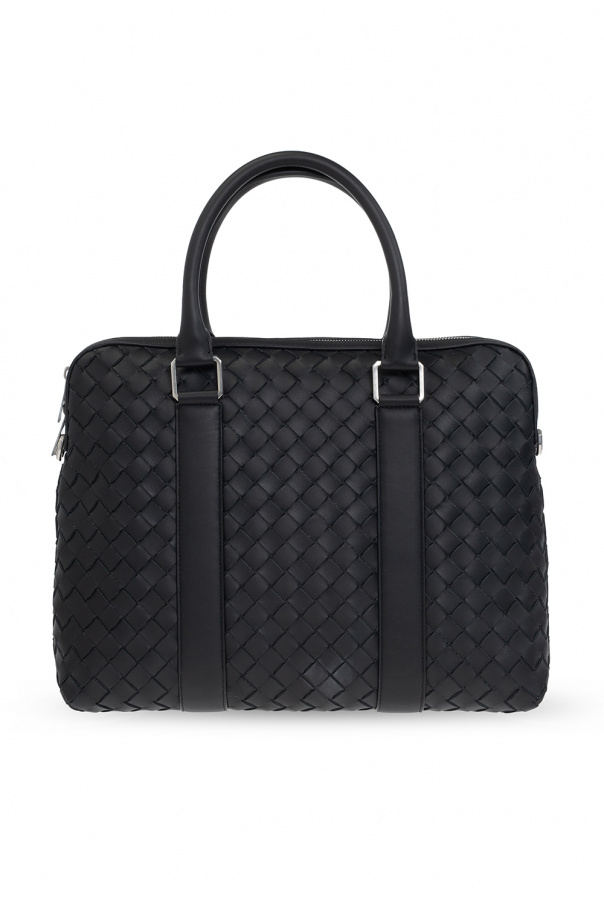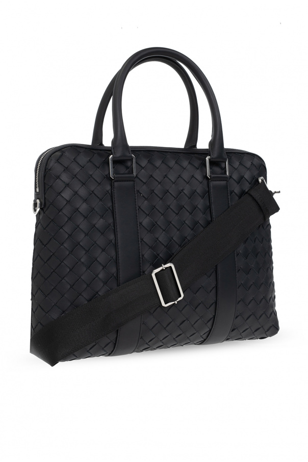 Black briefcase from Bottega Veneta. Made of leather with the Intrecciato weave, this model features a two-way zip fastening, two half-round handles, detachable and adjustable strap, silver-tone metal hardware and one internal compartment with one zip pocket.