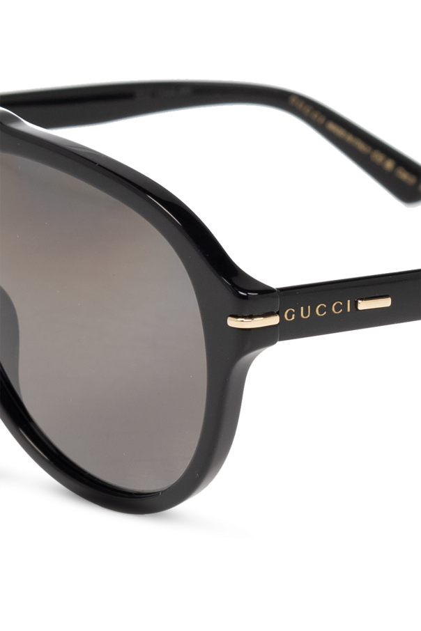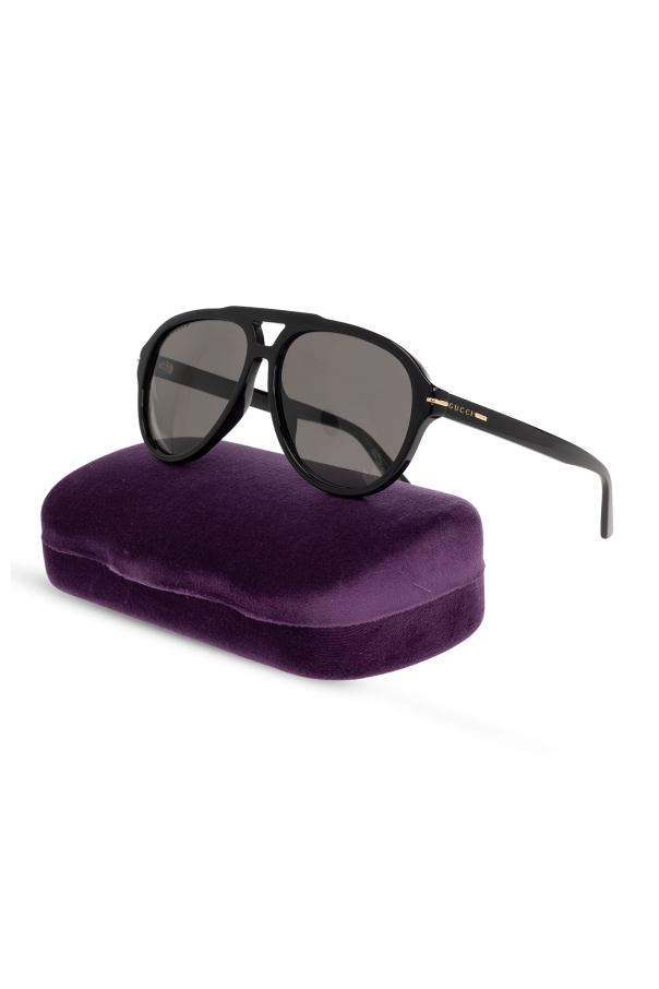 Black aviator sunglasses from Gucci. This pair features a gold-tone logo detail and grey lenses with 100% UV protection. Case included – the color will be individually selected for each pair of glasses.