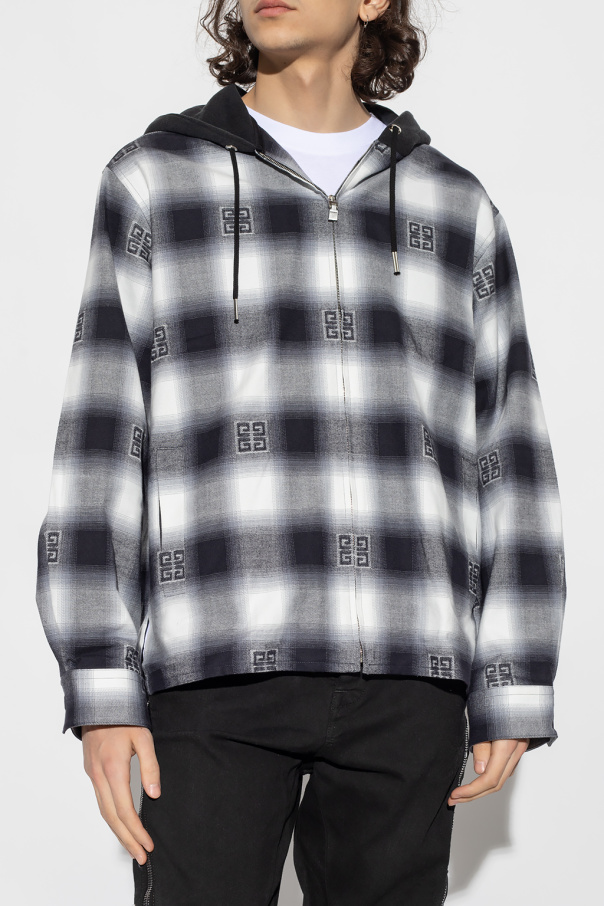 Black and grey sweatshirt with a drawcord-adjustable hood from Givenchy. Crafted from cotton jersey, this style fastens with a zipper and features a checked logo motif, two frontal pockets and long sleeves with snap-fastened cuffs.
