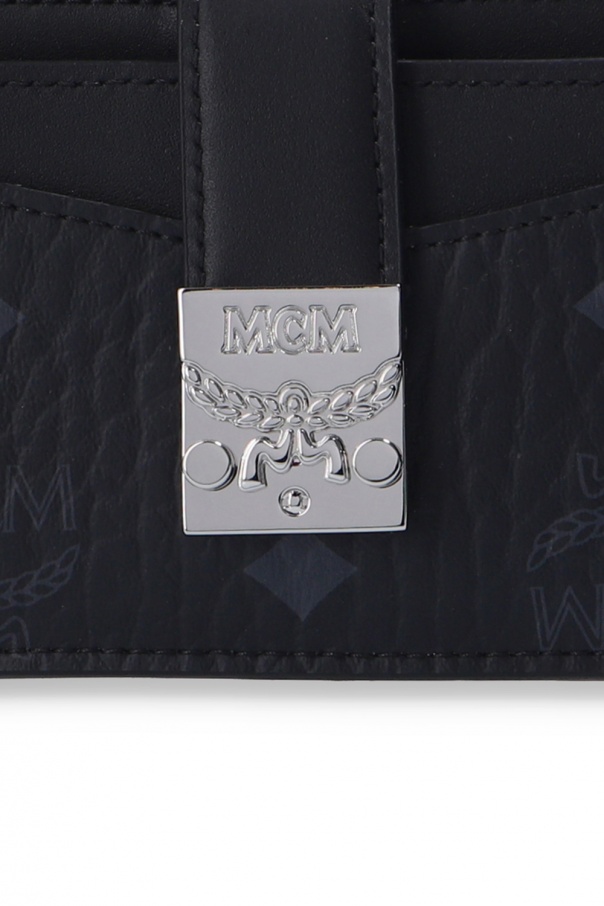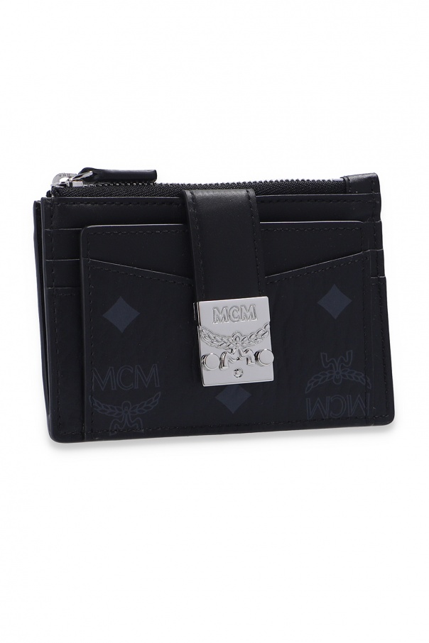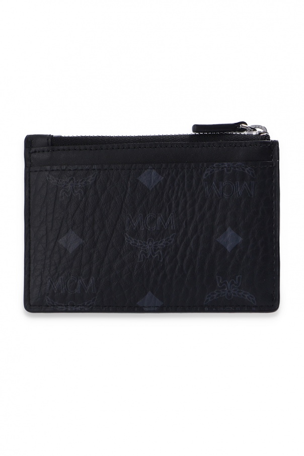 Black card holder from MCM. Crafted from the brand’s signature canvas with leather trims, this item features a snap fastening, grey logo pattern, silver-tone metal logo applique, zipped coin pocket and five card slots.