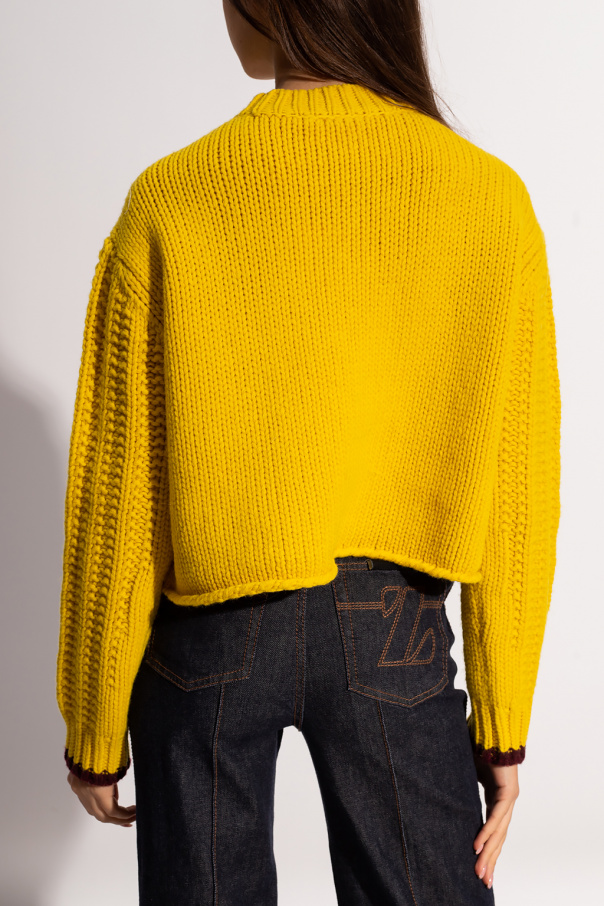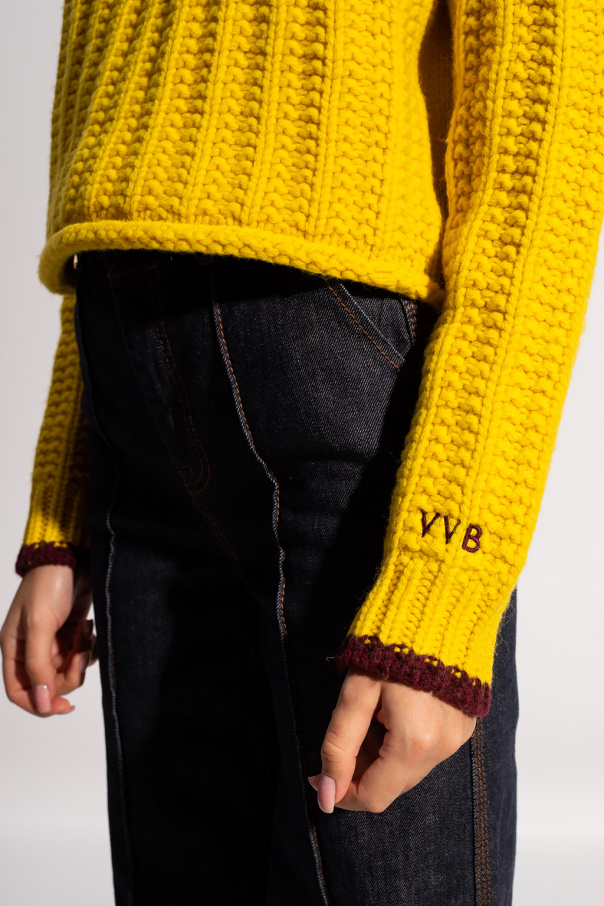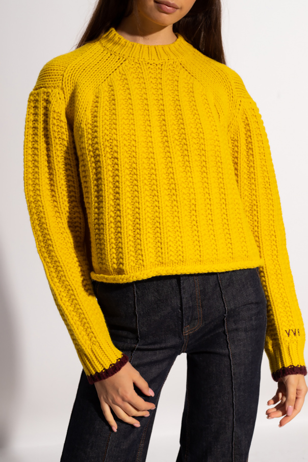Yellow crewneck sweater from Victoria Victoria Beckham. Crafted from wool, this style showcases the designer's logo embroidered on the sleeve, and contrasting brown edges on the cuffs.