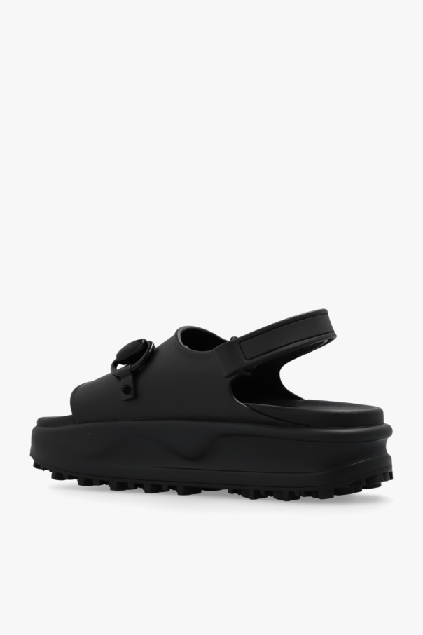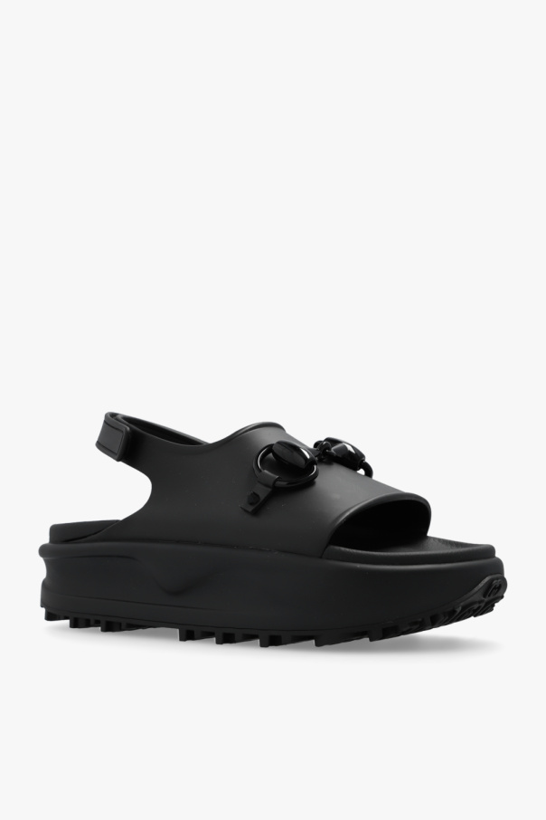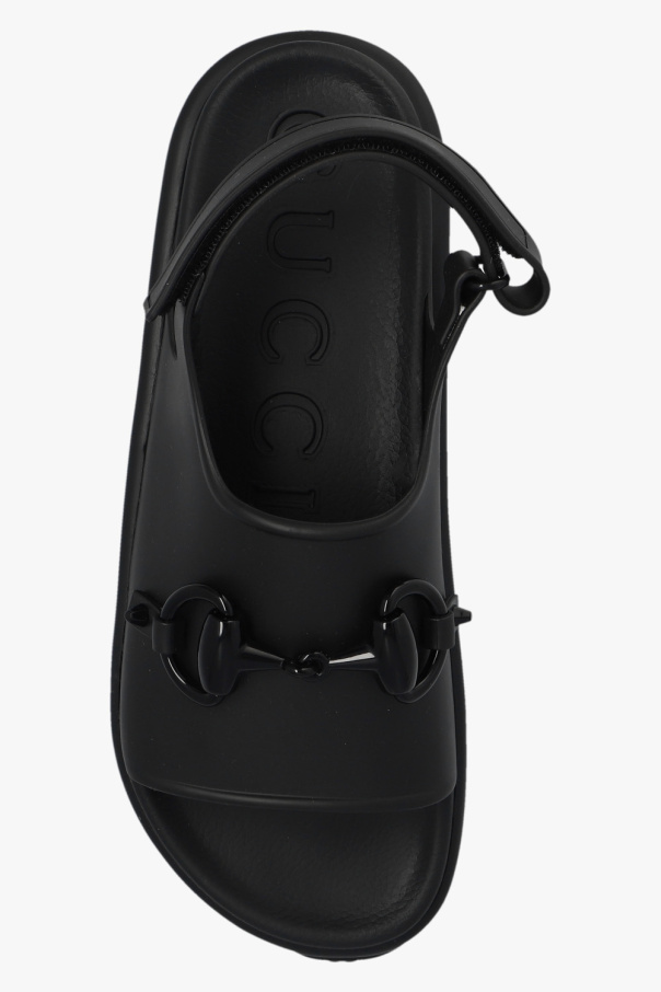 Black sandals from Gucci. Fastened with a velcro-fastened ankle strap, this pair features the iconic horsebit and black rubber sole.