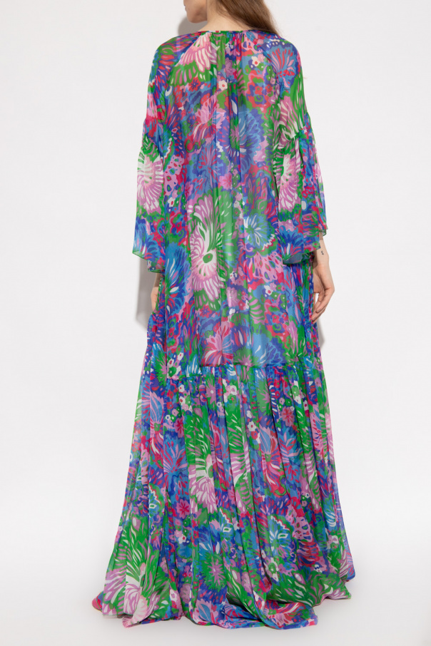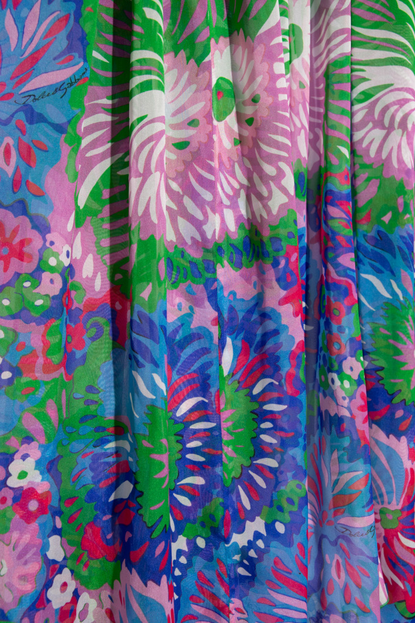 Multicoloured dress from Dolce & Gabbana. Made of silk with a flared silhouette, this style showcases a floral print, a round neck with drawstrings, flared, cropped sleeves and an asymmetrical hemline. It comes with a white chemise with a zipper and hook & eye closure and lace detailing.