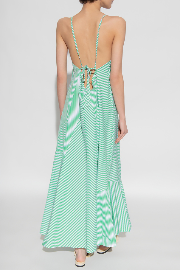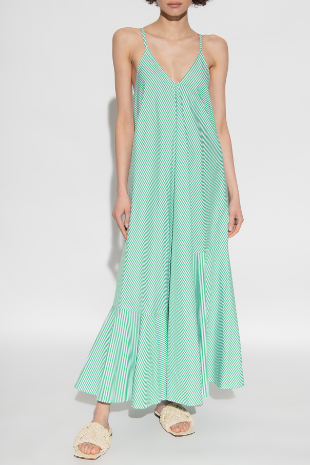 Green and white ’Lydon’ off-the-shoulder dress from Birgitte Herskind. Made of organic cotton, this loose-fitting design features criss-cross straps, pinstripe pattern and V-neck.