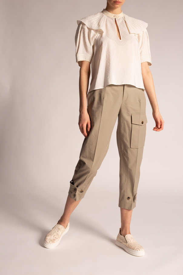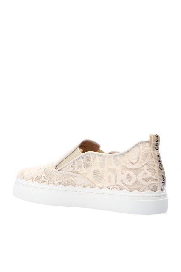 Cream sneakers from Chloé. Boasting a slip-on silhouette enriched by an openwork pattern with the brand\'s logo, this pair features a black logo print at the back and a white rubber sole at the base.