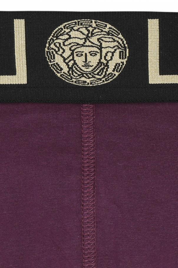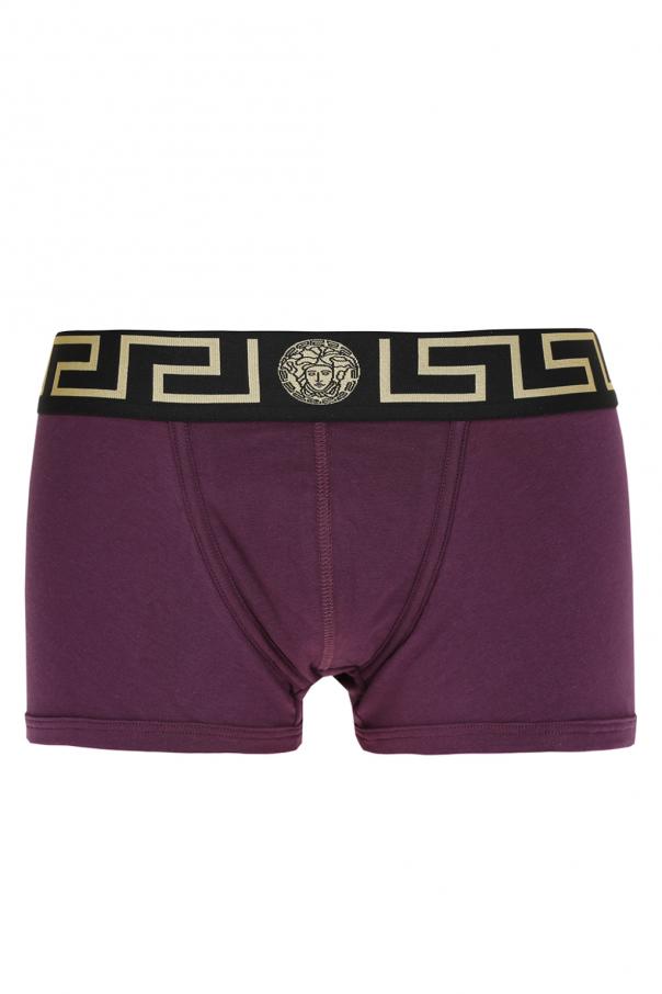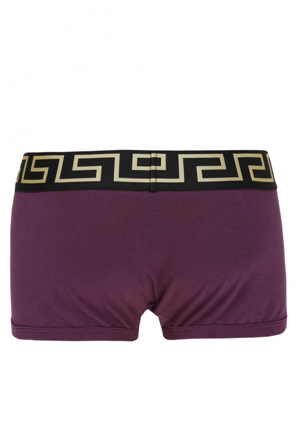 Maroon cotton boxers from Versace. Black elasticated waistband embellished with a gold-tone signature Greek pattern.