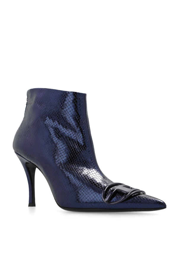 Navy blue ‘D-VENUS’ heeled ankle boots from Diesel. Made from fabric with a snakeskin effect, this model sits on a black leather sole and features a pointed toe accentuated with logo hardware and a back zip.