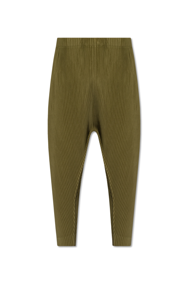 Dark green pleated trousers from Issey Miyake Homme Plisse. This low crotch design features an elastic drawstring waistband and two slip pockets.