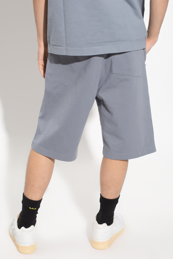 Greyish blue shorts from Acne Studios. Made of cotton, this pair features an elastic waistband with drawstrings, a blue logo print, two zip pockets, one slip pocket and wide legs.