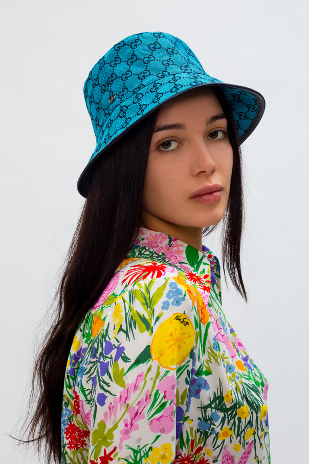 Blue and navy blue bucket hat from Gucci, 'GG Multicolor' collection. Crafted from cotton, this item showcases an embroidered GG pattern all over.