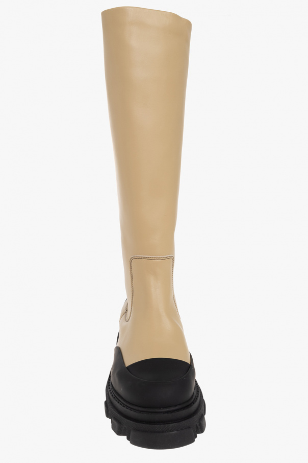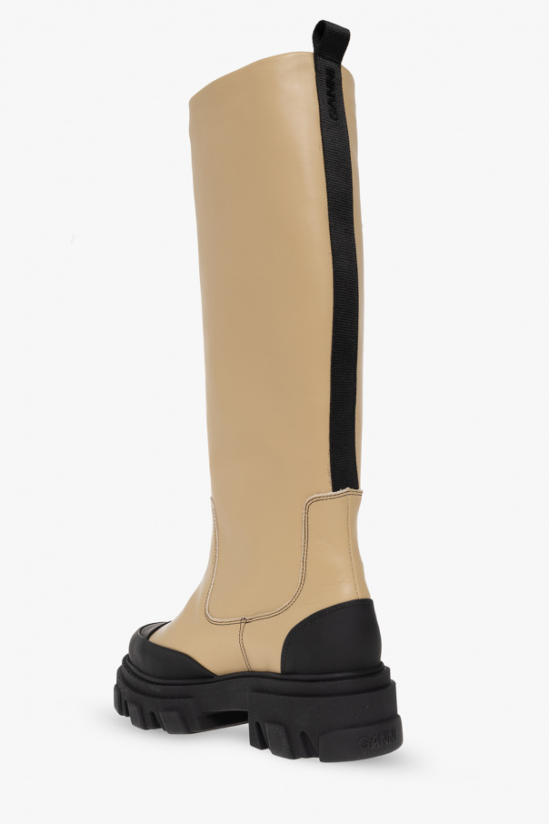 Beige and black boots from Ganni. Made o calf leather, this pair has a black grosgrain pull tab with a logo print and a black rubber sole.
