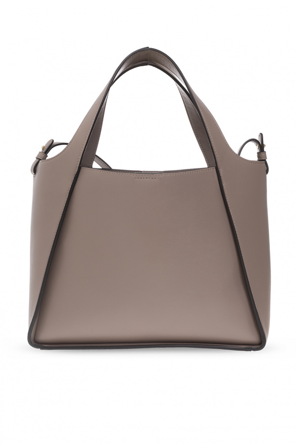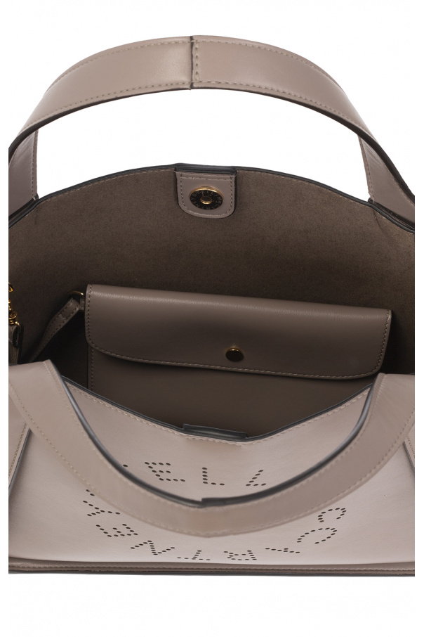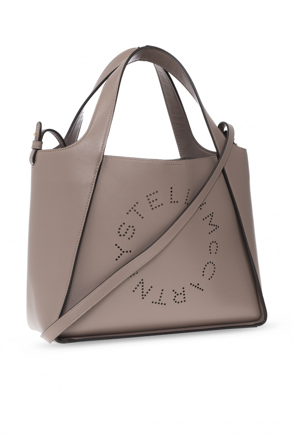 Greyish-brown shoulder bag from Stella McCartney. Crafted from faux-leather, this design secures with a magnetic snap and showcases a perforated logo, two half-round handles, a detachable and adjustable shoulder strap, gold-tone metal hardware, one internal compartment and a removable pouch with a snap-fastened flap.