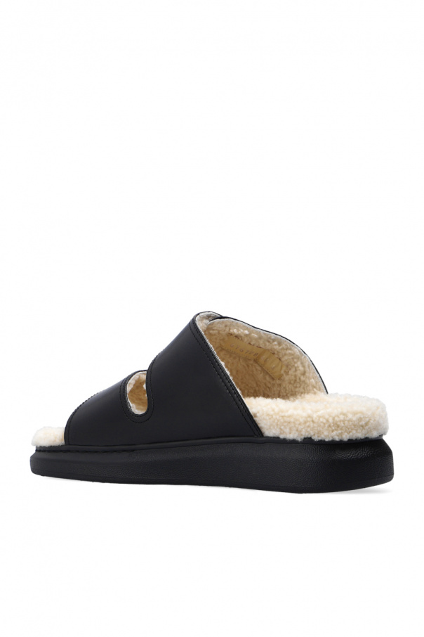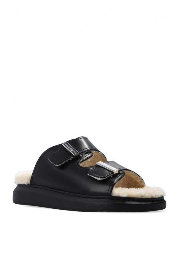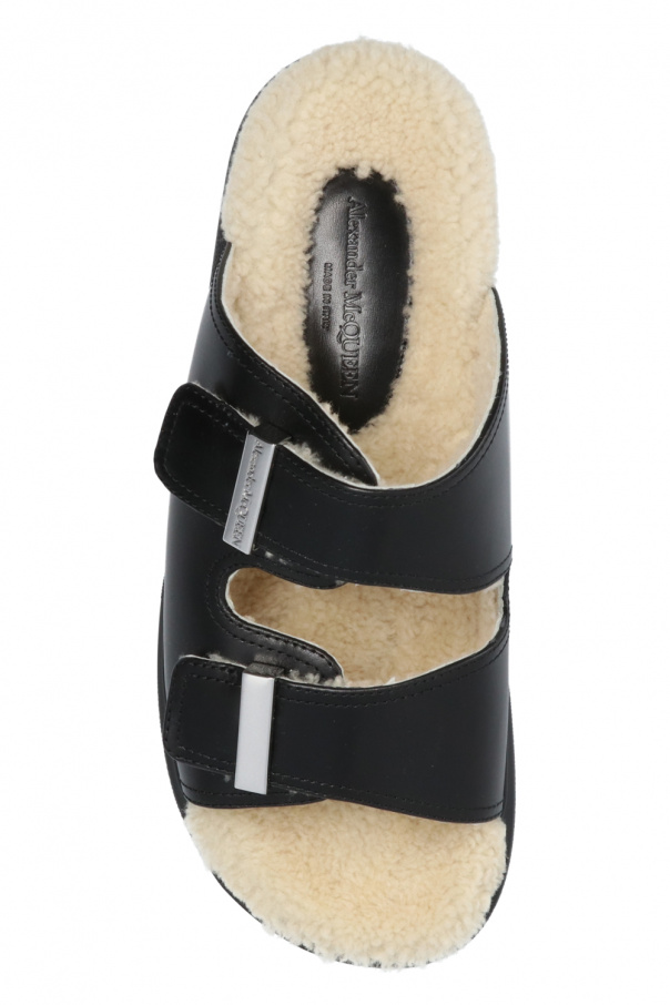 Black slides from Alexander McQueen. Crafted from leather, this model features buckle straps with an embossed logo, shearling lining and black rubber sole.