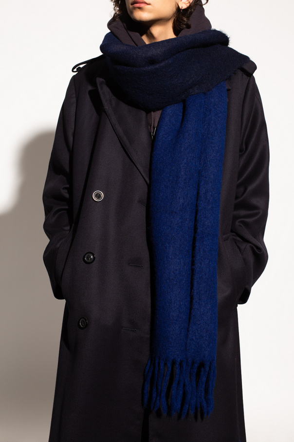 Dark blue scarf from Isabel Marant. Crafted from alpaca yarns with a gradient motif, this item showcases fringe detailing and an embroidered white logo.