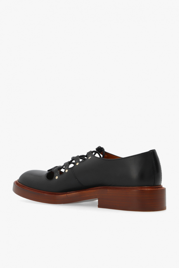 Black 'May’ loafers from Chloe. Crafted from calf leather, this lace-up model features distinctive cutouts, silver-tone metal hardware and a brown leather sole.